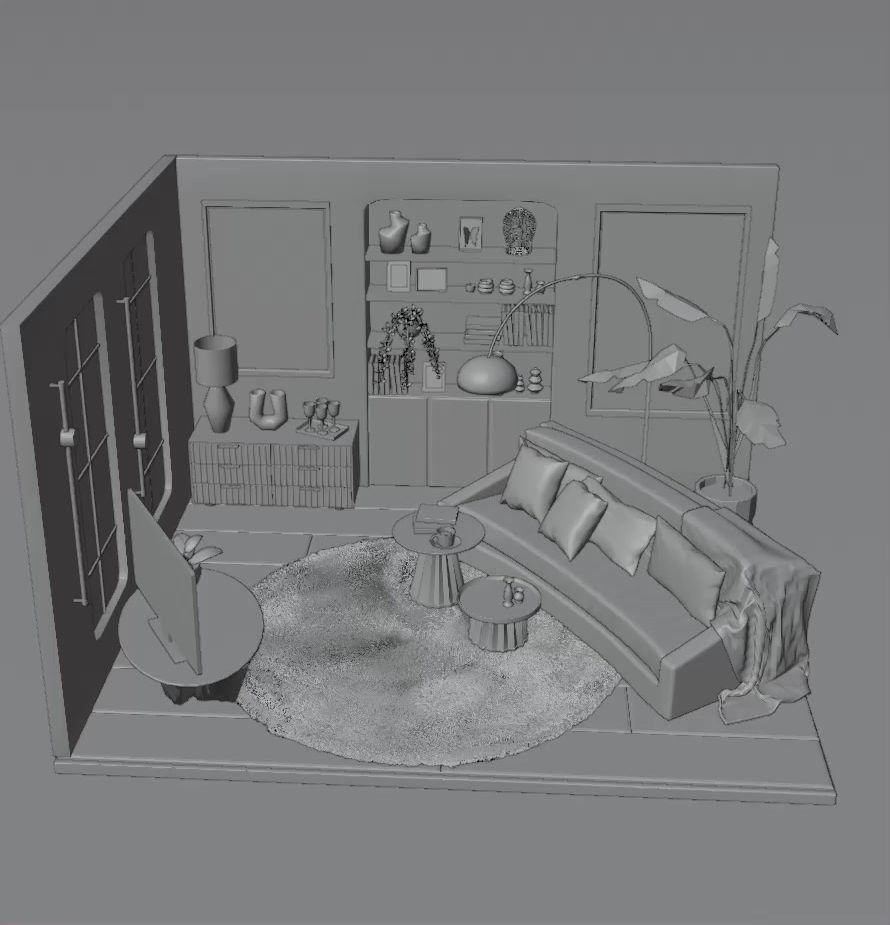 I created an isometric living room animation that shifts from morning to night, using light to capture time and mood.